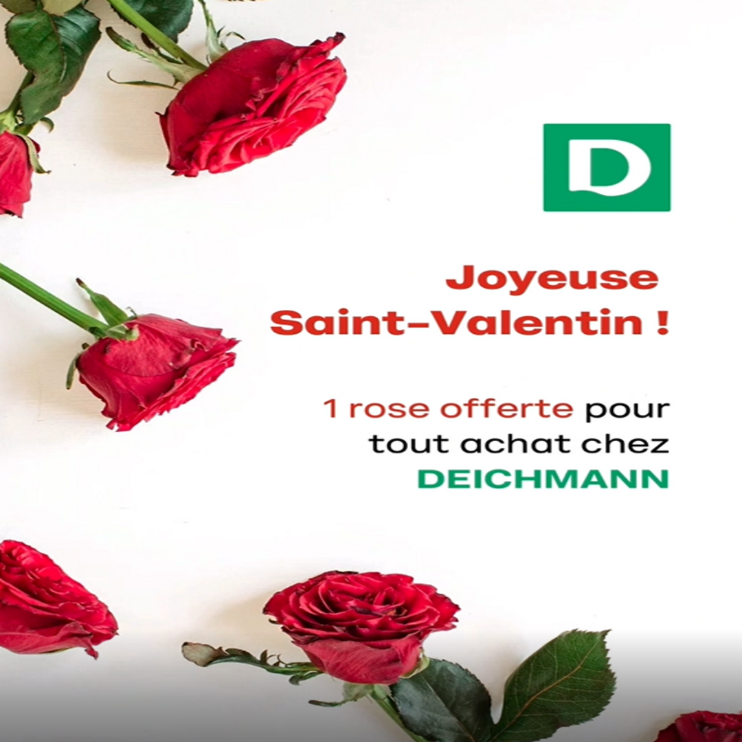 14 février 2025 Opération Roses avec Deichmann ! Le 14 février, pour chaque achat effectué, Deichmann vous offre une rose ! 🌹 *Pas de minimum d’achat, dans la limite des stocks disponibles. Partagez ceci : aller vers facebook.com aller vers la page contact